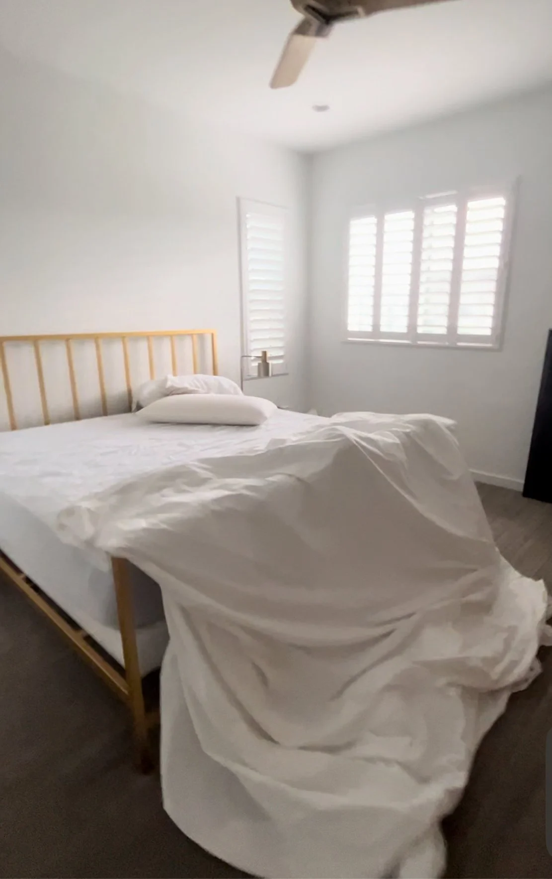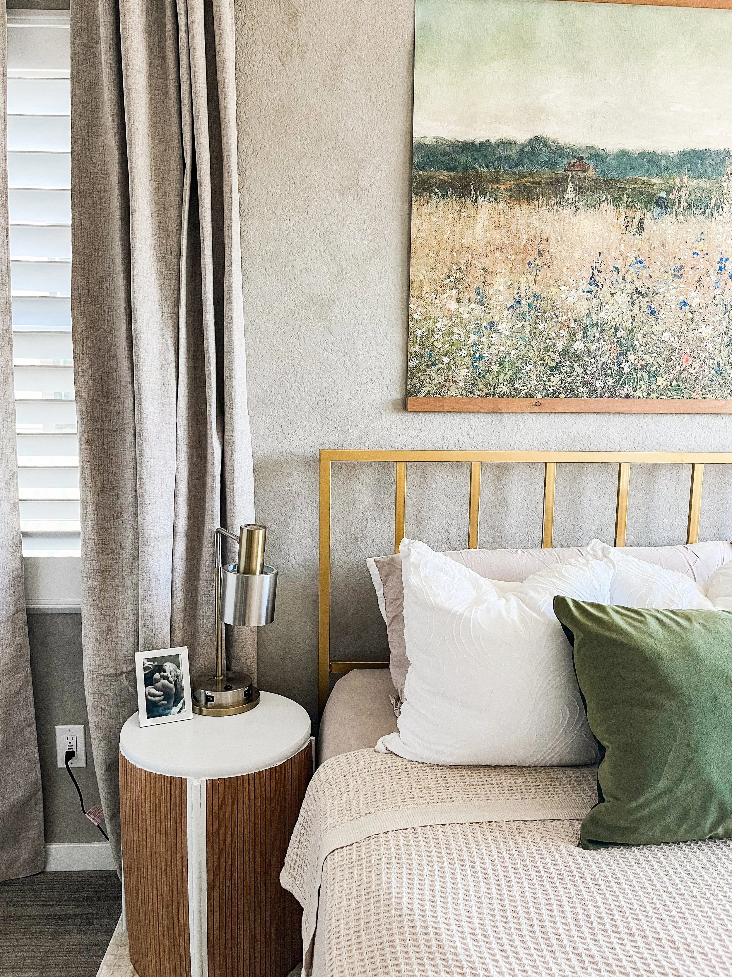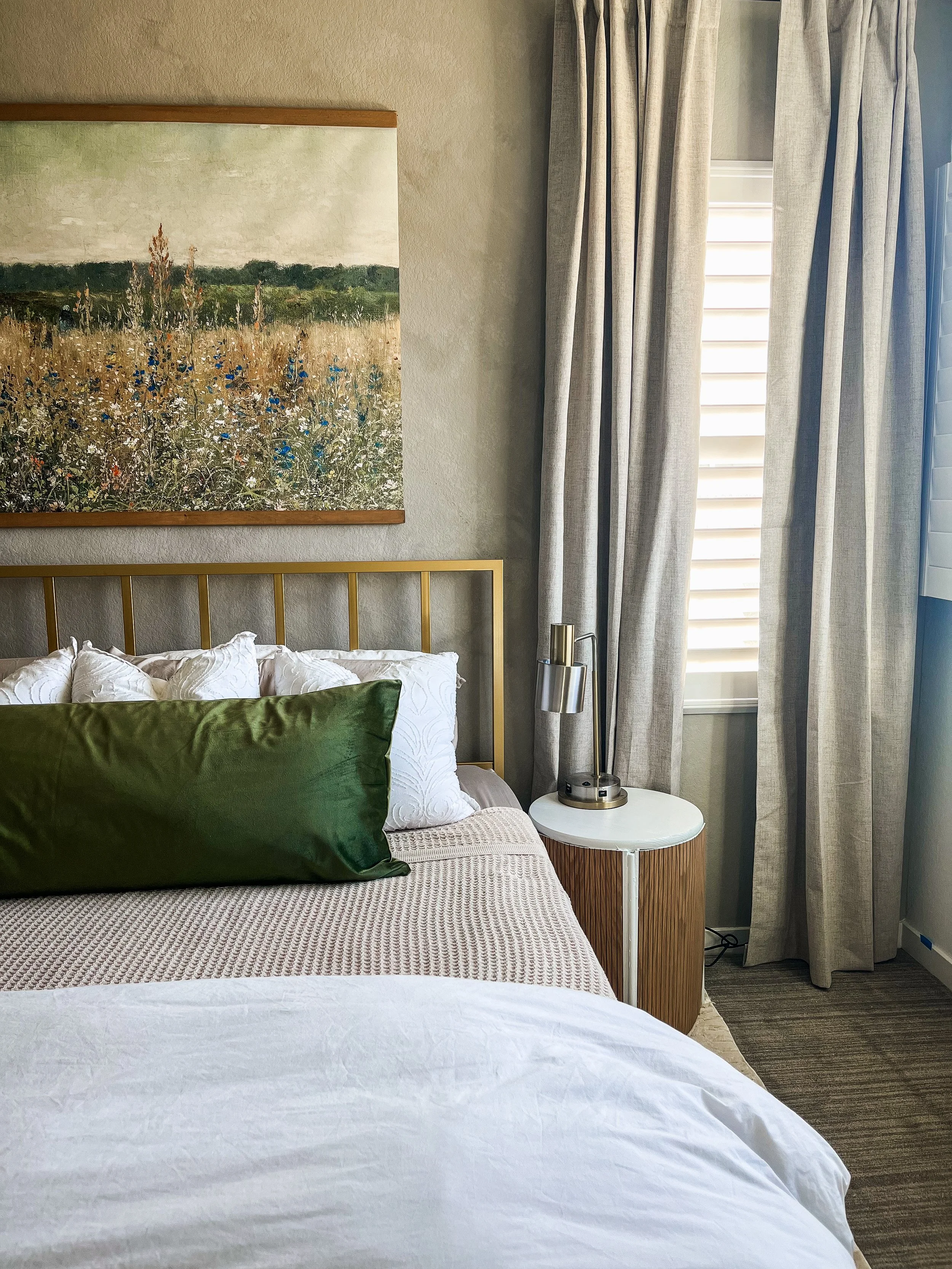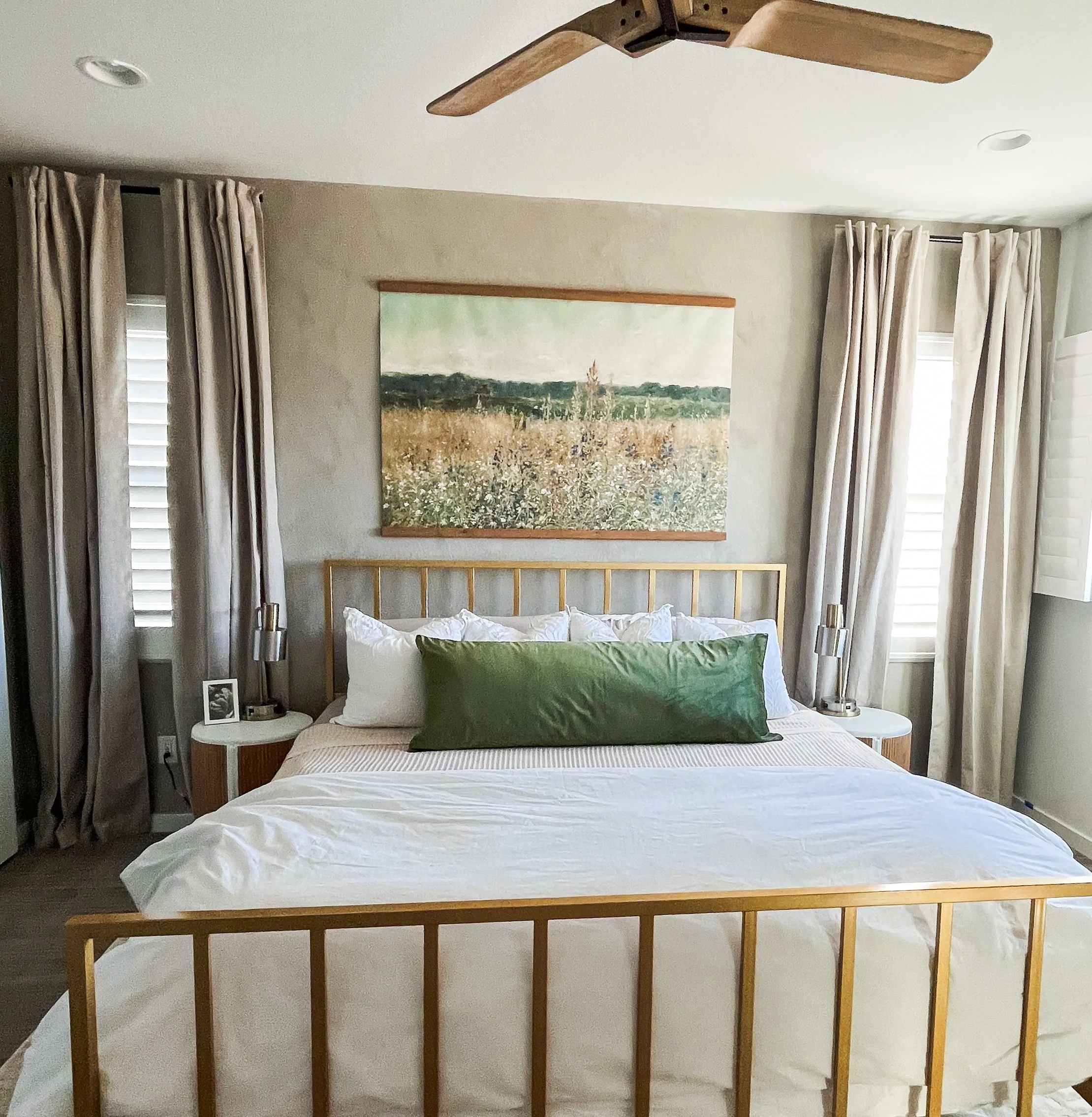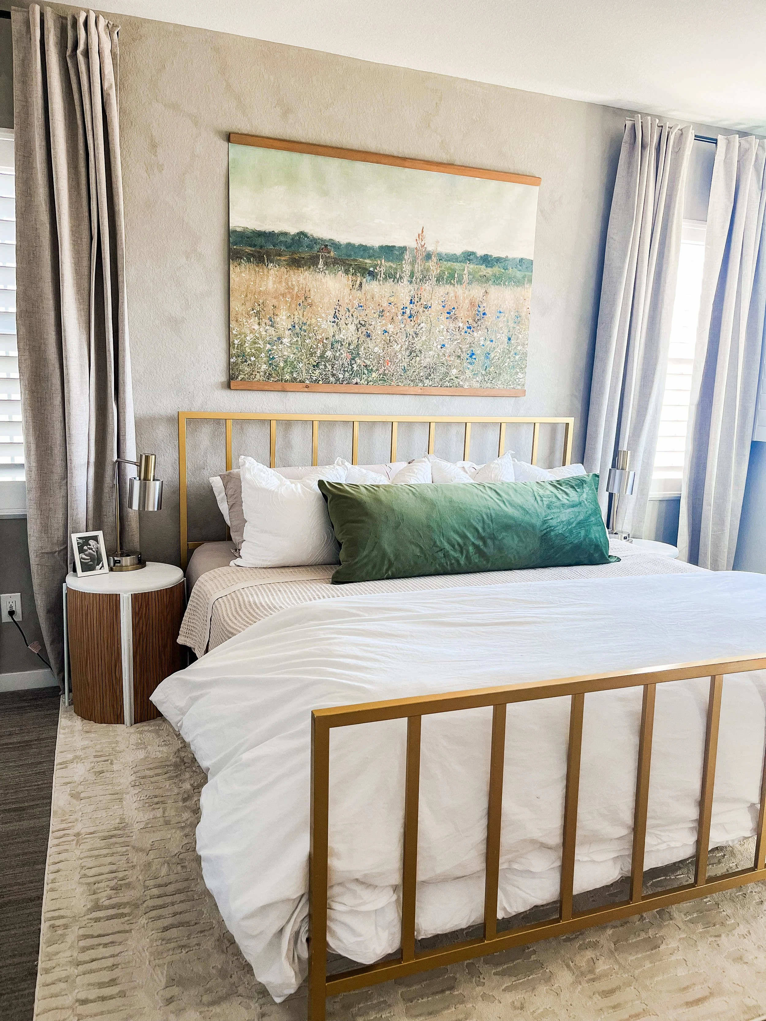 We took this plain primary suite and turned it into a cozy escape from reality. We designed this space to be warm and inviting, encapsulating the feel of a luxury bed and breakfast in the countryside.